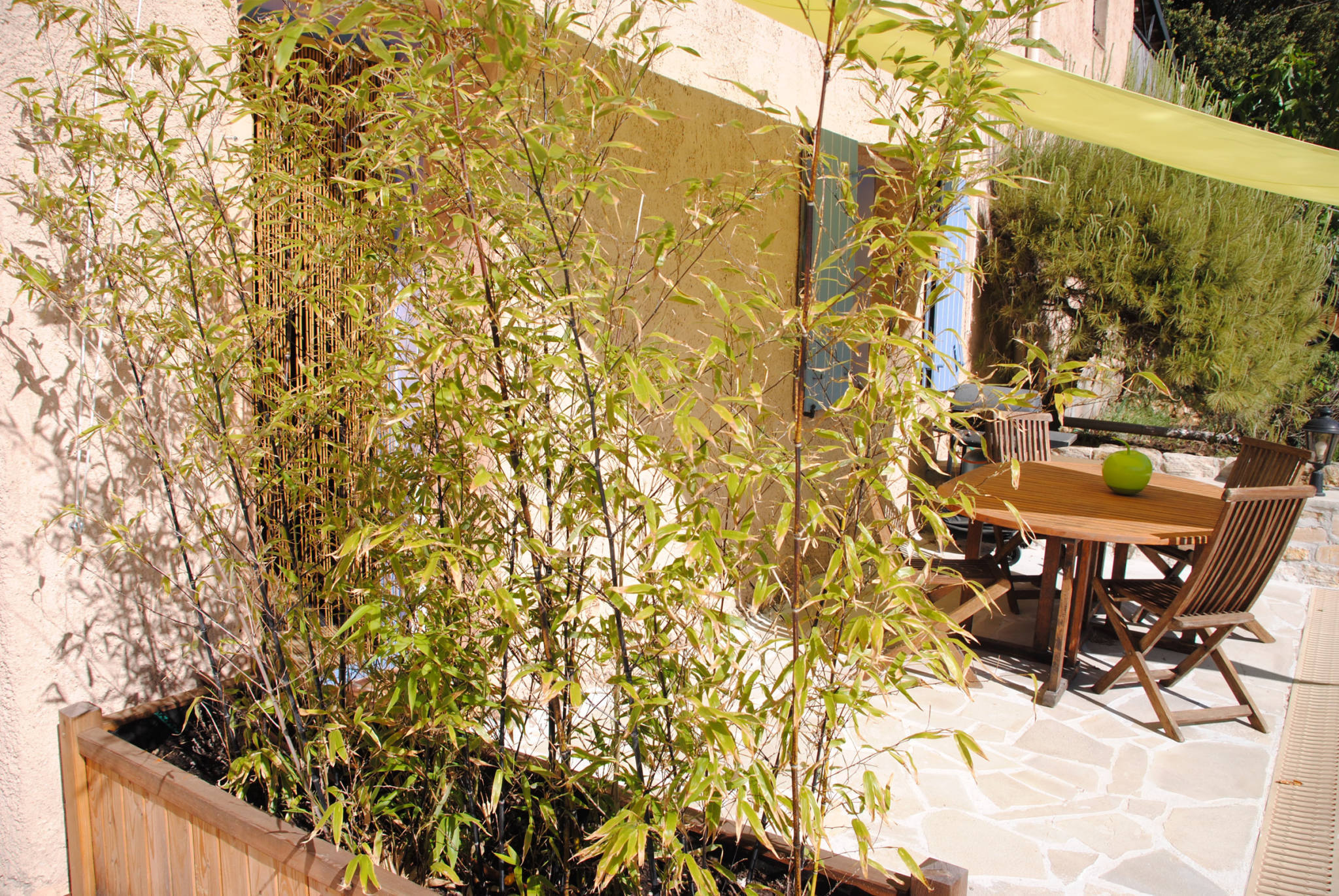 La terrasse privative dispose d'un barbecue à gaz et d'une grande table en teck. Une pergola en acier et bambou est tendue au-dessus de votre terrasse.