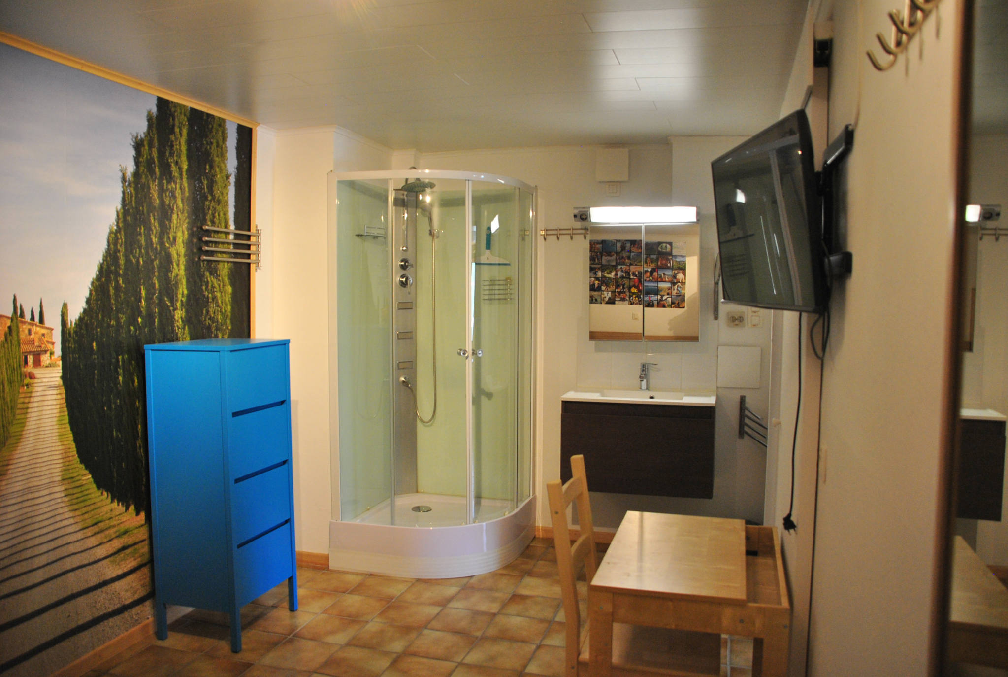 La télévision est installée dans cette chambre.